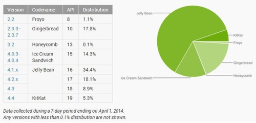 В настоящее время самой популярной версией Android остается Android 4.1.x Jelly Bean (34.4%), после следует Android 4.2.x Jelly Bean (18.1%). Интересно, что Android 2.3.3-2.3.7 Gingerbread (2010 года) до сих пор обгоняет по результатам Android 4.0.3-4.0.4 Ice Cream Sandwich, 17.8% и 14.3% соответственно.