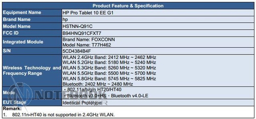 Подробностей относительно HP Pro Tablet 10 EE G1 пока очень мало. Предположительно, устройство будет оснащено 10-дюймовым экраном, учитывая название устройства, производителем которого является Foxconn. Среди характеристик гаджета ожидаем увидеть двухдиапазонный Wi-Fi 802.11b/g/n и Bluetooth 4.0, аккумулятор с потрясающей емкостью 7700 мАч.