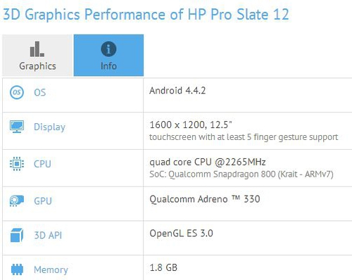 HP может забрать часть успеха у компании Samsung, выпустив свой гигантский Android-планшет. Устройство под названием HP Slate 12 Pro недавно появилось на сайте GFXBench. Похоже, что новинка от HP будет поставляться с 12.5-дюймовым дисплеем. Планшет также может быть оснащен четырехъядерным процессором Qualcomm Snapdragon 800, дисплеем с разрешением 1600х1200 пикселей (с соотношением сторон 4:3), 2 ГБ оперативной памяти и 16 ГБ встроенной памяти. С тыльной стороны расположена 8-мегапиксельная камера, а с фронтальной – 2-мегапиксельная.