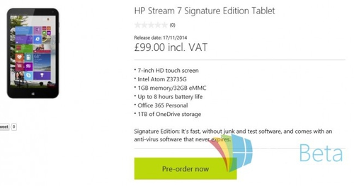 Новинка будет поставляться с пакетом программ Office 365 и 1 ТБ свободной памяти на OneDrive. Заметим, что устройство не является представителем высокого класса, данный гаджет идеально подойдет для выполнения стандартных ежедневных задач, таких как проверка электронной почты, работы в программах Office и воспроизведения видео. 7-дюймовый планшет работает на ОС Windows 8.1 with Bing. Отметим, что при заказе устройства через Microsoft Store, покупатель получит Signature Edition, это означает, что для пользователей продукта будут доступны все программные фитчи HP абсолютно безвозмездно.