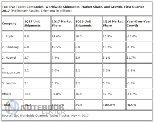 К сожалению, спад коснулся и компании Apple (на 13%), количество проданных iPad составило 8.9 млн штук. Зато Huawei увеличила процент поставок на 31.7%, реализовав 2.7 млн планшетов.
