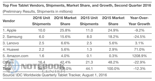 Как известно, по итогам второго квартала мировые продажи планшетов заметно уменьшились. Во всяком случае это подтверждается цифрами – снижение на 12%, а это с 44.1 млн штук до 38.7 млн. Компанию Apple также затронуло падение продаж, тем не менее, ей все равно удалось удержаться на высшей ступени. Например, за второй квартал прошедшего года было реализовано порядка 11 млн планшетов, тогда как за период апрель-июнь 2016 г «яблочный» гигант не дотянул до 10 млн экземпляров. Интересно, что на фоне снижения продаж iPad, количество выпущенных iPad Pro помогло увеличить рыночную долю. Правда, разница с Android-планшетами (26% против 65%) все равно ощутима.