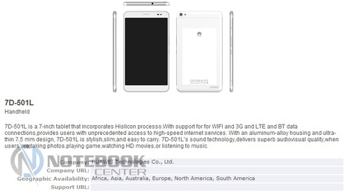 Huawei часто выпускает новые устройства, поэтому и сейчас информация о выходе новинки никого не удивила. Модель планшета 7D-501 сейчас получает аттестацию Bluetooth SIG.