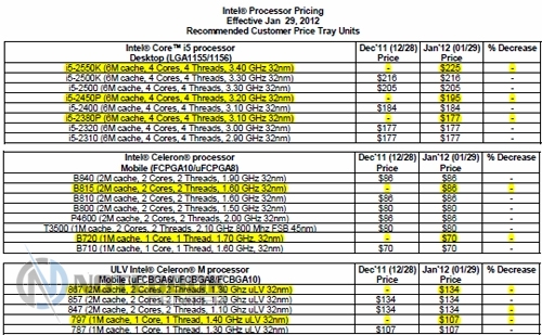 В табличке ниже можно видеть рекомендуемые цены на процессоры Intel. В списке видно семь новых процессоров, четыре из которых направлены на бюджетные ноутбуки. Эти четыре процессора относятся к семейству Celeron и основаны на архитектуре Sandy Bridge. Среди новинок модели 867 и 797, B815 и B720, два последних поступят в продажу в качестве настольных процессоров.