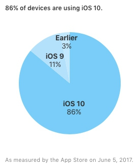 На официальном сайте Apple опубликована статистика распространения версий операционной системы. Известно, что на начало июня 2017 года наиболее популярной является iOS 10, ее доля составляет 86%. Предыдущая версия сильной уступает в количестве, достигая лишь уровня 11% из всех iPad, iPhone и iPod touch.