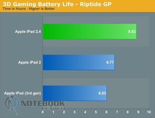 Сайт AnandTech сделал подробный обзор нового iPad 2. По их данным 32 нм процессор HK + MG A5 энергоэффективней, чем чипы A5 в старых моделях. В тестах AnandTech, новый iPad 2 показал время работы от батареи на 15-30% лучше, чем предшествующая модель.