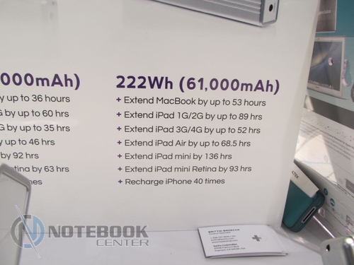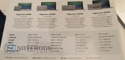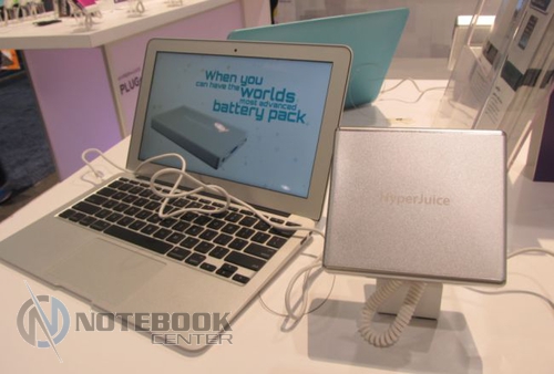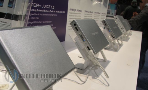 Компания HyperJuice производит внешние аккумуляторы, которые можно использовать для зарядки телефонов, планшетов или ноутбуков Apple. Самая большая модель имеет емкость 61000 мАч (222 Втч), что позволяет продлить время работы MacBook на 53 часа, перезарядить iPhone 40 раз или обеспечить на 136 часов больше времени работы на iPad mini.