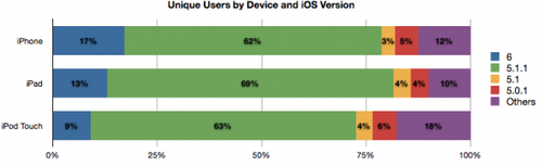 Заметим, что сразу несколько докладов (от специалистов компаний Chitika и Chartboost) сообщают о стремительных темпах внедрения iOS 6. В отчете Chartboost есть более глубокий анализ, к примеру, на данный момент уже 17% iPhone-пользователей перешло на шестую версию ОС. Для сравнения, 13% владельцев iPad обновились до iOS 6, и лишь 9% - пользователей iPod. Подавляющее большинство iDevice все еще работает на IOS 5.1.1, но это лишь вопрос времени.