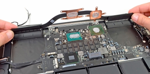 Кроме того, по утверждениям того же пользователя с китайского форума, новые 13- и 15-дюймовые Pro будут иметь все те же разъемы: справа - MagSafe 2, пару Thunderbolt, один USB 3.0 и мини-джек, а слева - один USB, HDMI и SD кардридер. Среди минусов - теплоотвод аналогичен 15-дюймовому ноутбуку, но с одной контактной площадкой. Это все равно, что вот с этой фотографии от iFixit убрать медную пластину.