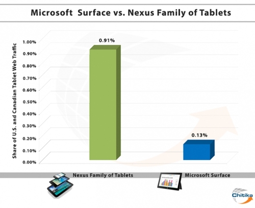 Хороший показатель реальной ситуации с Microsoft Surface – это сокращение заказов на планшет в четвертом квартале почти вдвое. Среди специалистов бытует мнение, что продажи MS могут достичь лишь 1 млн единиц в 2012 году, а то и вовсе меньше. Рекламная компания Chitika предоставила свою отчетность по планшетному интернет-трафику, в которой Surface имеет лишь 0.13%, учитывая территорию США и Канады.