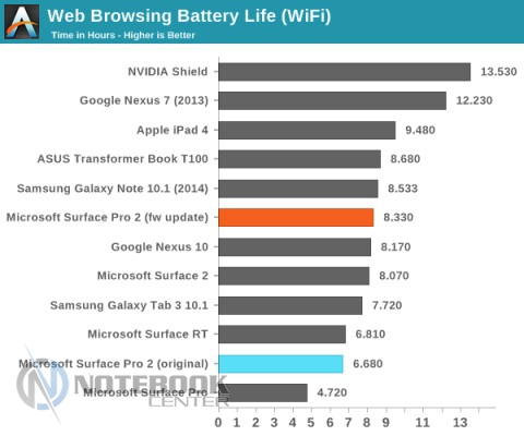 Ананд Лал Шимп (Anand Lal Shimp) из AnandTech протестировал устройство и подтвердил положительное влияние прошивки на работу аккумулятора. Surface Pro 2 теперь работает до 8 часов от одного заряда, и это заслуживает шестого места в рейтинге продолжительности времени автономной работы планшетов. Места в таблице распределились следующим образом, от первого к десятому: Galaxy Note 10.1, Transformer Book T100, iPad 4, Nexus 7 2013, NVIDIA Shield, Surface RT, Surface Pro 2, Galaxy Tab 3 10.1, Surface 2 и Nexus 10.