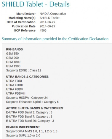 После многочисленных слухов относительно планшета NVIDIA Shield, устройство одобрено сертификатом Global Certification Forum (GCF), что подтверждает его существование. Модель была протестирована в июне специалистами из GCF. Гаджет поддерживает сети LTE, однако никакой информации о наличие Wi-Fi или 3G-моделей нет.