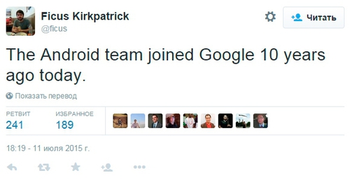 Энди Рубин (Andy Rubin) создал свою независимую компанию более десяти лет назад, тогда он и его команда приступили к работе над Android. В то время про них никто ничего не знал, и компания пыталась привлечь к себе внимание Google. И им действительно удалось это сделать. Google приобрела компанию и разработанную ею операционную систему. Фикус Киркпатрик (Ficus Kirkpatrick) в своем Твиттере написал, что это столь ожидаемое событие произошло 11 июля 2005 года. Киркпатрик был частью Android-команды в то время, работает он в Google и по сей день.