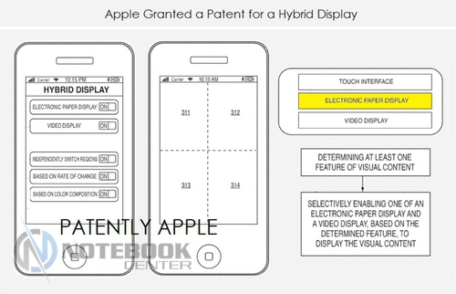 Компания из Купертино также подчеркнула, что эти 2 типа дисплеев на самом деле вертикально наращиваемые, либо один из них будет полностью отключаться, чтобы можно было хорошо видеть второй в зависимости от потребностей и запускаемых приложений. Можно будет переключиться на любой тип дисплея вручную, а можно будет воспользоваться автоматическим режимом, ведь гаджеты с такими экранами смогут сами анализировать сложившуюся ситуацию, учитывая запущенные приложения, а затем выбрать наиболее оптимальный вариант отображения. Так для просмотра веб-страниц или игр идеальным будет полноцветный режим с высоким разрешением, но когда дело будет касаться чтения электронных книг, то черно-белый монохромный экран может быть предпочтительнее.