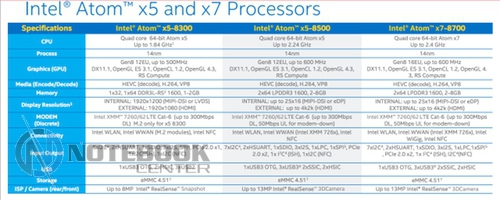 Intel Atom x5 и Atom x7 ранее известны как «Cherry Trail» предлагают 64-битный интерфейс и встроенную графику Intel Graphics 8-го поколения. Оба семейства поддерживают Intel RealSense snapshot и Intel RealSense 3D camera (R100 и R200). Pro WiDi и True Key также присутствуют.