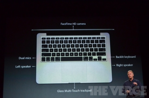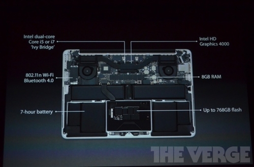 Самым интригующим моментом была начинка устройства. Итак, 13" Macbook Pro Retina может оснащаться 768 Гб флеш-памяти, 8 Гб оперативной памяти, процессором Core i5 или i7 поколения Ivy Bridge, встроенной видеокартой Intel HD Graphics 4000, 802.11n Wi-Fi и Bluetooth 4. А встроенная батарея обеспечит до 7 часов автономной работы.