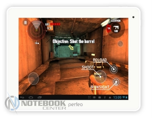 Толщиной в 9.9 мм, гаджет является достаточно тонким, вес его составляет 660 г. Если чуть подробнее о начинке планшета, то 1.6 ГГц процессор работает с графикой Mali 400 MP4. 10 000 мАч аккумулятор по истине впечатляет. К слову скажем, батарея iPad 3 очень близка к установленной в Perfeo 9726-RT. Единственное разочарование в том, что устройство не снабжено четырехъядерным процессором.