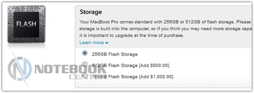 Еще недавно в базовой модели ноутбука за $2200 не было возможности добавлять или менять комплектующие, кроме увеличения оперативной памяти с 8 до 16 Гб за $200. И вот просьбы покупателей учтены и Apple теперь предлагает укомплектовать младшую модель SSD-накопителем объемом 512 и 768 Гб за, ни много, ни мало, $500 и $1000 соответственно. Также можно улучшить процессор за $100, установив модель частотой 2.6 ГГц , а не 2.3 ГГц.