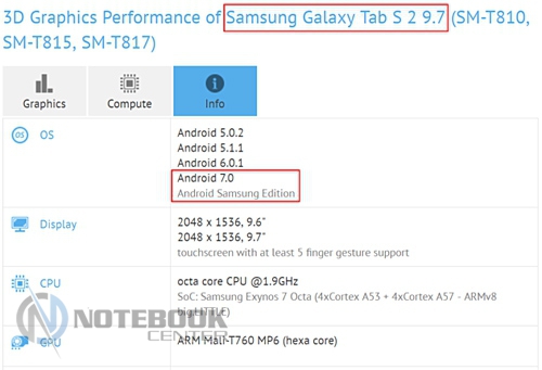 Скорее всего, 9.7-дюймовый планшет Samsung Galaxy Tab S2 не будет томиться в ожидании обновления до самой новой операционной системы Android 7.0 Nougat. Так, при тестировании данного устройства в GFXBench на предмет быстродействия видно, что «седьмая» прошивка уже для этой модели готова.