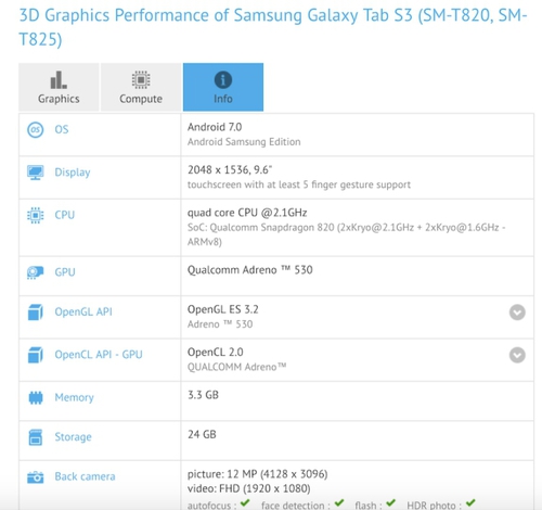 Анонс Samsung Galaxy Tab S3 намечен на первый квартал 2017 года, однако, уже сейчас можно ознакомиться с первыми тестами, попавшими в Сеть. Устройства с модельными номерами SM-T820 и SM-T825 демонстрируют гораздо более мощные показатели, нежели прошлогодние утечки. Так, в бенчмарке можно увидеть уже 4 ГБ оперативной памяти вместо 3 ГБ, а известные ранее процессоры Qualcomm Snapdragon 652 и Samsung Exynos 7420 заменены на Qualcomm Snapdragon 820. Также, планшет получил 9.6-дюймовый дисплей с высоким разрешением 2048х1536 пикселей, веб-камеры на 5 Мп и 12 Мп, 32 ГБ внутренней памяти. Операционная система – Android 7.0 Nougat. Официальное объявление новых планшетов от Samsung намечено на выставке MWC 2017 (27 февраля по 2 марта, Барселона).