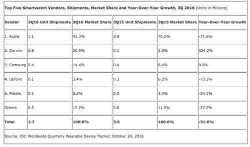 Компания IDC провела анализ рынка смарт-часов, в опубликованном отчете сказано, что за третий квартал 2016 года продажи гаджетов упали на 51.6%, до 2.7 млн экземпляров, в то время, как в 2015 году данный показатель составлял 5.6 млн.