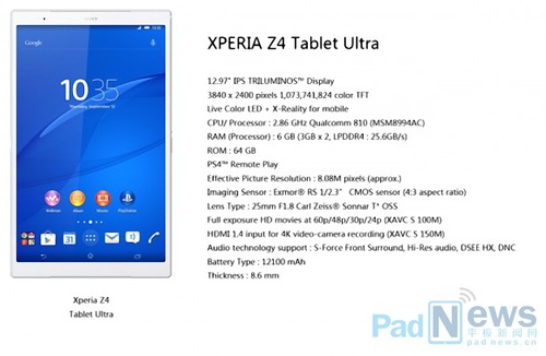 Еще в конце прошлого года ходили слухи, что Xperia Z4 Tablet будет оснащен 12.9-дюймовым дисплеем с разрешением 3840х2400 пикселей, процессором Qualcomm Snapdragon 810, 6 ГБ оперативной памяти и 64 ГБ встроенной памяти. Что из этого правда, а что нет, узнаем совсем скоро.