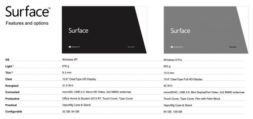 Планшет Surface представлено в двух вариациях - под операционные системы Windows RT и Windows 8 Pro. Версия для Windows RT будет доступна с флеш-накопителями на 32 Гб и 64 Гб, как только выйдет Windows 8 и будет продаваться по цене аналогичных ARM-таблеток. Pro версия появится позже на 3 месяца с 64 Гб и 128 Гб памяти и будет находится в ценовом диапазоне ультрабуков.