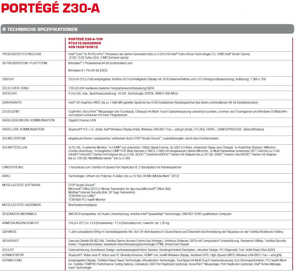 По сравнению с моделью начального уровня Portege Z30-A-192 (стоимостью 1450 евро), Portege Z30-A-1Cr может похвастаться несколько обновленными характеристиками – 13.3" дисплеем с разрешением 1366х768 пикселей, 128 ГБ SSD-накопителем. Кроме того, Toshiba решила использовать более мощный процессор Intel Core i5-4310U вместо Intel Core i5-4210U.