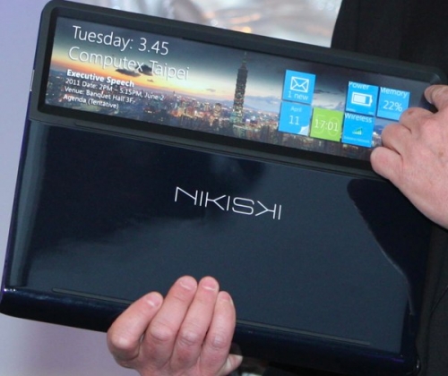 На выставке CES 2012 компания Intel продемонстрировала интересный ультрабук - Intel Nikiski. Этот ультрабук с прозрачной сенсорной панелью. Что интересно, так это то, что в этом ультрабуке с помощью этой полоски, которая расположилась на месте традиционного тачпада и упоров для рук, том, можно получить доступ к мультимедиа, а также веб-приложениям даже тогда, когда крышка ноутбука закрыта.