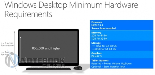 Для современных устройств данные требования довольно-таки просты. Они разделены на два вида – «рабочий стол», который охватывает ноутбуки и устройства 2-в-1, и «мобильные устройства», такие как планшеты и смартфоны. Consumer версия Windows 10 будет доступна для устройств с 8-дюймовыми дисплеями и больше, а Pro-издание, как бы ни забавно звучало, для 7-дюймовых и выше. Что касается минимального разрешения экрана, оно должно составлять не меньше чем 800x600 пикселей.