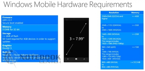 Для мобильных устройств требования еще более специфические. Минимальны объем ОЗУ – 512 МБ, это для 32-битных процессоров. Что касается места для хранения данных, его должно быть не менее 4 ГБ, при этом устройство должно иметь слот для microSD-карты, которая потребуется для получения обновлений. В категорию «мобильные устройства» попадают гаджеты с размерами экрана от 3 до 7.99 дюймов, а минимальное разрешение экрана будет зависеть от объема оперативной памяти.