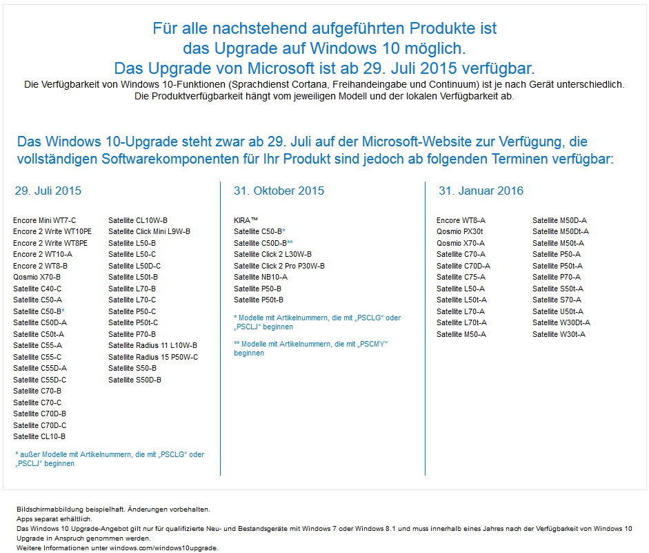 Toshiba создала удобный график, в котором видно, когда пользователям конкретных моделей ожидать оптимизированных драйверов для Windows 10. Компания планирует выпустить обновленные драйвера, начиная с 29 июля по 31 октября 2015 года, а также 31 января 2016 года.