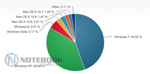 Операционная система Windows 8 продолжает завоевывать расположение пользователей, однако делает это очень медленно. За последние 28 дней среди всех ОС самой популярной опять стала Windows 7 с 44.55% долей рынка, за ней идет Windows XP с результатом в 38.99%.