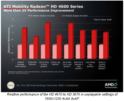 AMD в день выхода HD 4000 Series опубликовала тест с сравнительными результатами для видеокарт HD 4670 и HD 3670. Тесты проводились на быстрых Quad-Core CPU и завышенных настройках с 1600х1200 разрешением, 4хАА и 16хAF. Следовательно, приведенный график актуален лишь для исключительных ситуаций и показывает преимущества перед предшественником только в некоторых случаях.